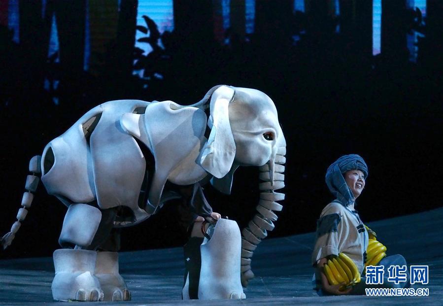 5月15日在上海美琪大戲院拍攝的新版大型人偶舞臺劇《最后一頭戰(zhàn)象》劇照。 當日,作為第12屆中國藝術節(jié)的參演劇目,大型人偶舞臺劇《最后一頭戰(zhàn)象》在經過4次硬件技術升級和故事修改后亮相上海美琪大戲院。 新華社記者 任瓏 攝