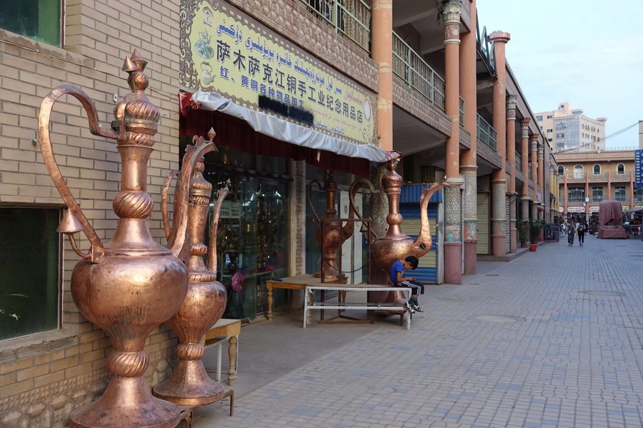 兩千多年前,這里是古疏勒國王宮所在地,從500多年前建立艾提尕爾清真寺起始,吾斯塘博依街逐漸成為一條喧鬧繁華的主街,匯聚了當?shù)刈畛錾哪芄で山?,是名副其實的手工藝品一條街。李仁奇 攝