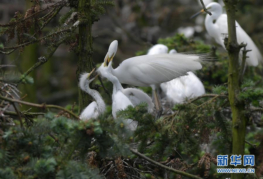 在江西省南昌市新建區(qū)象山森林公園內(nèi),白鷺和自己的雛鳥在一起(5月21日攝)。 近日,在江西省南昌市新建區(qū)象山森林公園內(nèi),已安家筑巢的大批鷺鳥陸續(xù)孵化出了后代。象山森林公園有著“鷺鳥王國”的美譽(yù),生態(tài)環(huán)境良好,每年都會吸引白鷺、蒼鷺、夜鷺等種類的鷺鳥飛抵棲息和繁衍后代。 新華社記者 彭昭之 攝