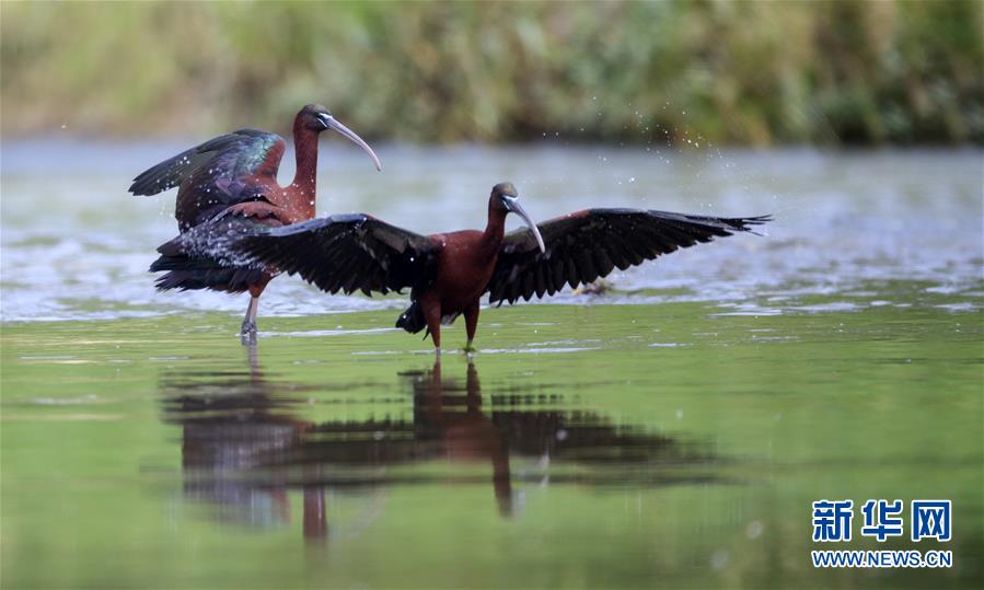 這是在漢江濕地公園嬉水的2只彩鹮(5月4日攝)。 近日,國家二級保護動物彩鹮現(xiàn)身陜西省漢中市漢江濕地公園濂水河與漢江交匯處。 據(jù)陜西師范大學(xué)生命科學(xué)院教授于曉平介紹,彩鹮在世界上的分布比朱鹮還要少,這幾年在云南發(fā)現(xiàn)得多一些,這3只彩鹮現(xiàn)身漢江濂水河畔,是陜西首次發(fā)現(xiàn)彩鹮蹤跡。 據(jù)了解,彩鹮是國家二級保護動物,屬鵜形目鹮科,體羽大部為青銅栗色,是珍稀鳥類朱鹮的“近親”,體型比朱鹮略小。 新華社發(fā)