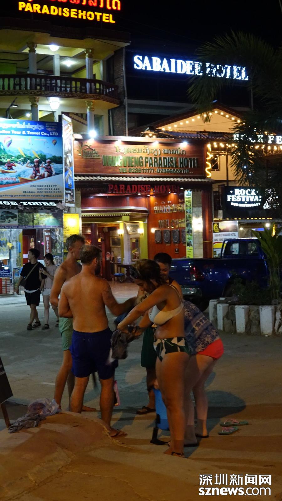 萬榮的開放程度很高。夜晚,南松河畔、街道兩旁都是酒吧,常常可以看到漂流回來身著泳裝的“老外”當(dāng)街站立。李仁奇 攝