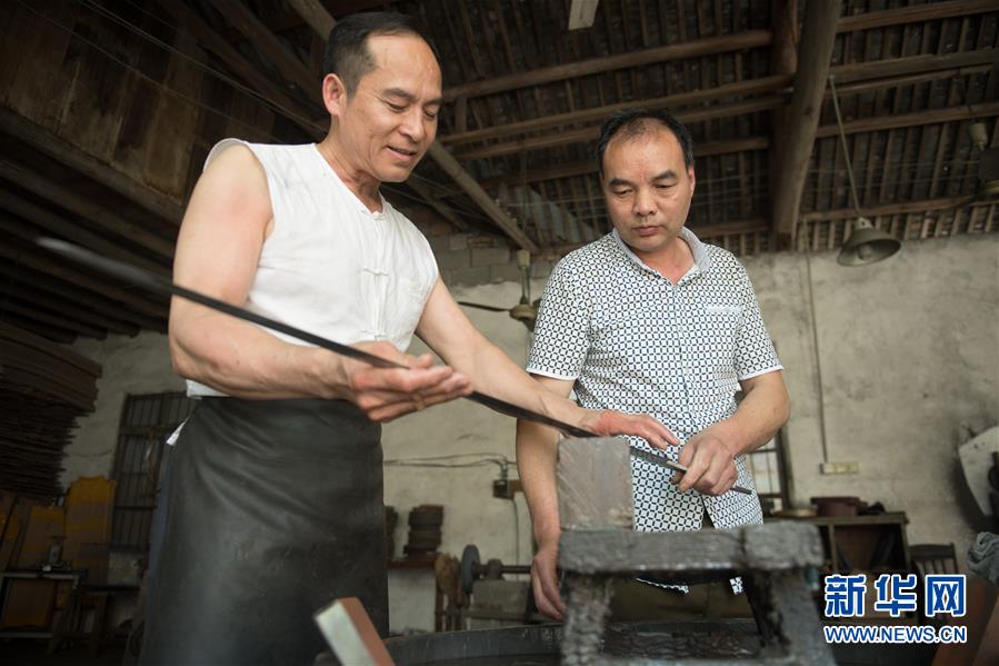 5月21日,鄭國(guó)榮(左)和磨劍師吳長(zhǎng)友交流磨劍細(xì)節(jié)。吳長(zhǎng)友是鄭國(guó)榮在國(guó)營(yíng)劍廠的老同事,跟隨鄭鑄劍20余年。 新華社記者 翁忻旸 攝