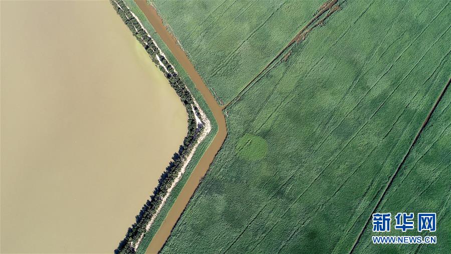 這是天津市寧河區(qū)七里海濕地內(nèi)蘆葦和水面形成的圖案(6月22日無人機拍攝)。新華社記者 岳月偉 攝