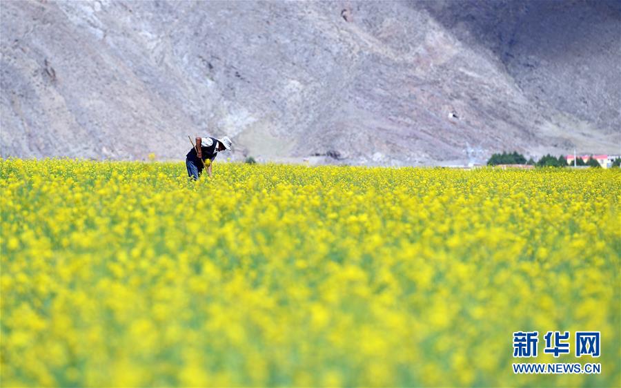 7月2日,拉薩市堆龍德慶區(qū)德慶鄉(xiāng)的村民在打理油菜花田。 近日,西藏各地的油菜花盛開(kāi),呈現(xiàn)出生機(jī)勃勃的夏日美景。 新華社記者 李鑫 攝