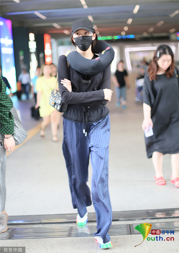 關曉彤淡定抱臂行走 脖子上掛U型枕毫無偶像包袱