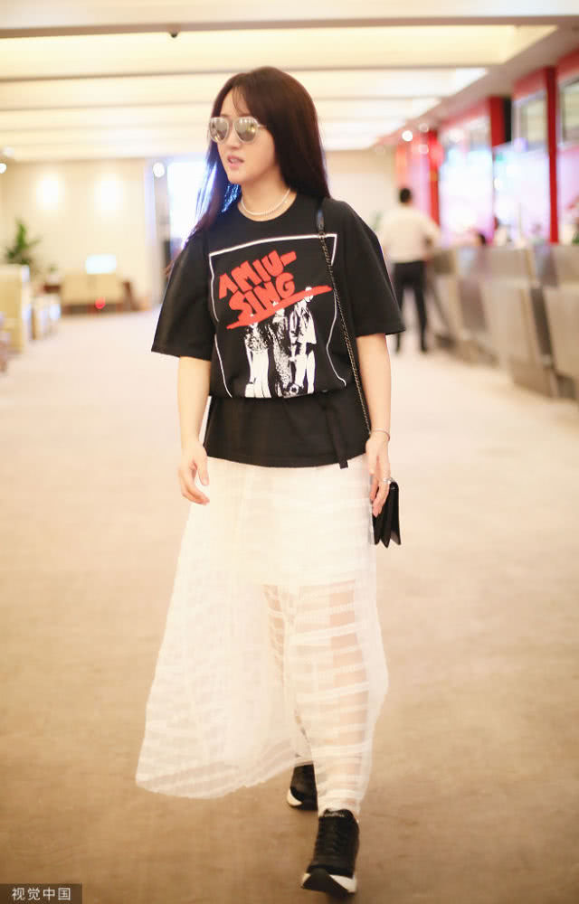 2019年7月30日訊,楊鈺瑩現身機場,穿黑T搭白色長裙灑脫時尚,挎CHANEL鏈條包,膚白貌美少女感十足。