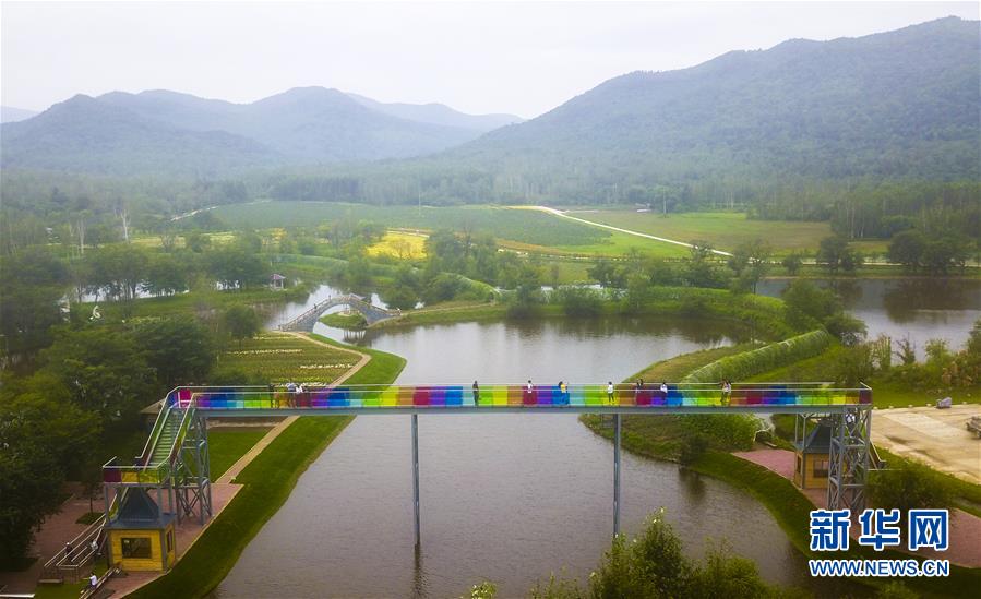 8月8日,游客在伊春市九峰山養(yǎng)心谷景區(qū)玻璃棧橋上行走(無(wú)人機(jī)拍攝)。 時(shí)值八月,黑龍江省伊春市林區(qū)空氣清新,涼爽宜人,吸引眾多游客。 新華社記者李曉果攝