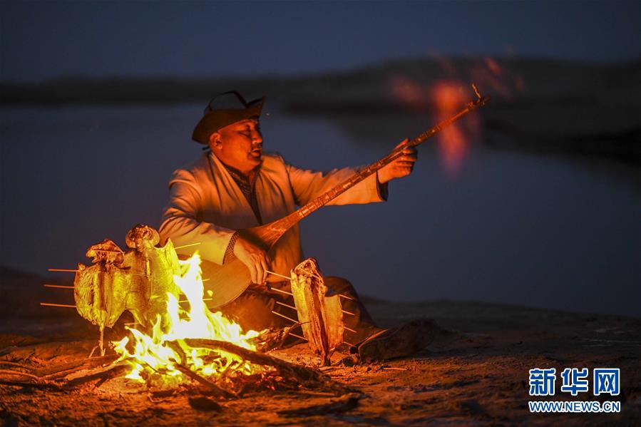 在羅布人村寨,阿木東·艾不東在沙漠里的一處海子旁彈奏樂(lè)器,等待烤魚(yú)烤熟(4月11日攝)。新華社記者 趙戈 攝