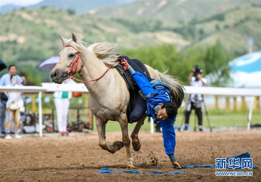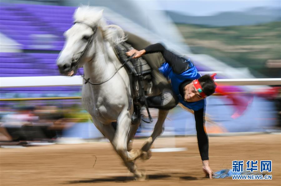 8月20日,騎手在“蒙古馬”傳統(tǒng)技巧表演中展示騎馬拾哈達。 新華社記者 彭源 攝