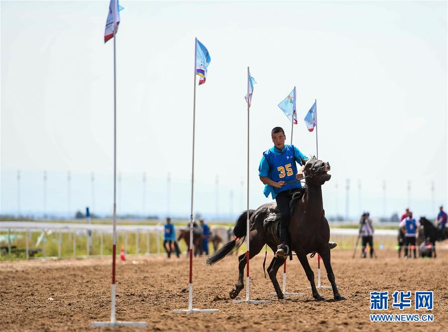 8月20日,騎手在“蒙古馬”傳統(tǒng)技巧表演中展示騎馬穿樁。 新華社記者 彭源 攝