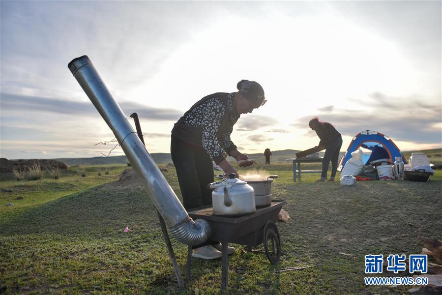 在新疆阿勒泰地區(qū)福海縣,牧民在轉(zhuǎn)場(chǎng)途中生火做飯(6月5日攝)。新華社記者丁磊攝
