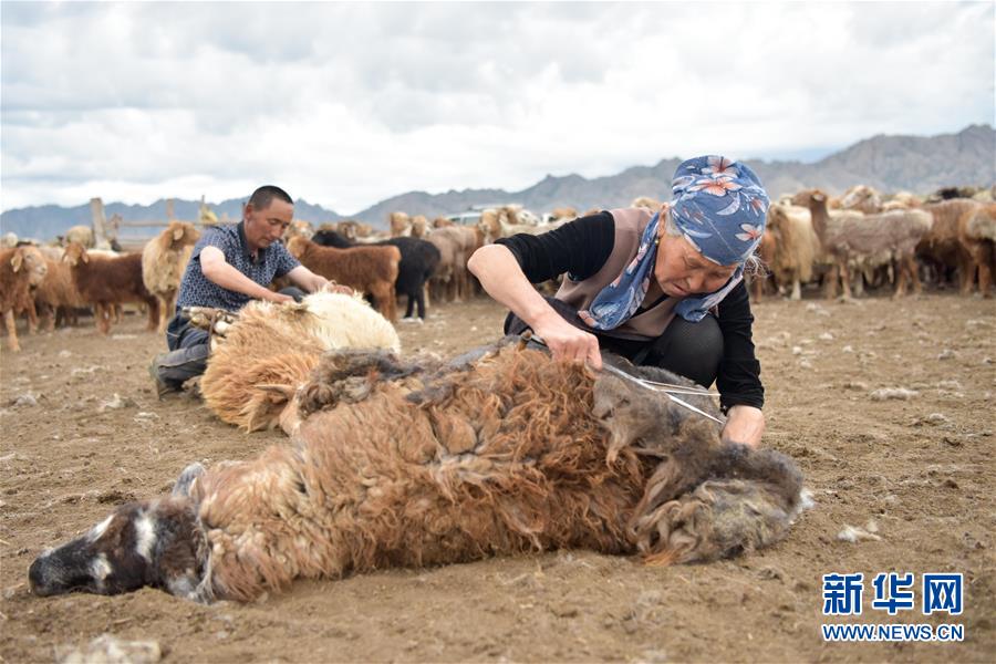 牧民趕著牛羊轉(zhuǎn)場到夏季牧場,安頓妥當后的第一個工作就是給羊剪羊毛(6月7日攝)。新華社記者丁磊攝