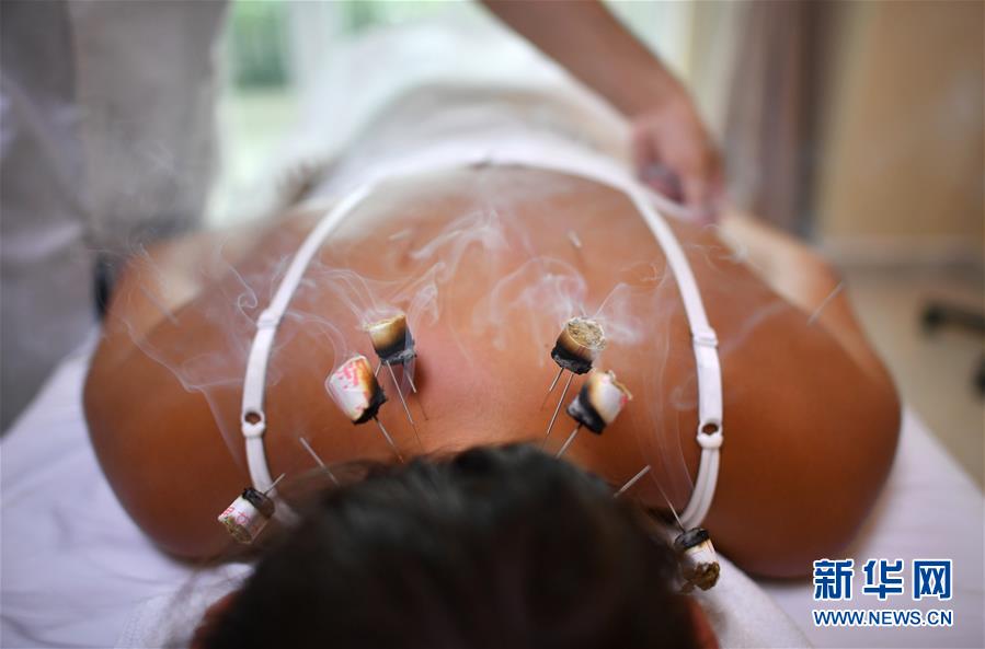 俄羅斯游客維多利亞·米哈拉普在三亞國(guó)際友好中醫(yī)療養(yǎng)院進(jìn)行中醫(yī)理療(2018年6月2日攝)。新華社記者郭程攝