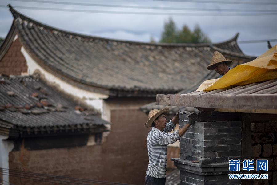 工人邱社云(左)在石屏縣異龍鎮(zhèn)符家營村211號民居修繕圍墻(8月8日攝)。新華社記者 江文耀 攝