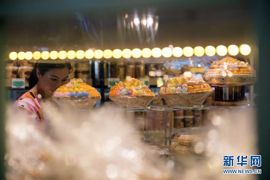 9月1日,顧客在泰國(guó)曼谷著名的“九姐妹甜點(diǎn)”店挑選傳統(tǒng)泰式甜點(diǎn)。新華社記者 張可任 攝