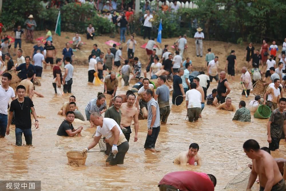 有人撒魚(yú)網(wǎng),有人用網(wǎng)兜,還有人直接徒手捉魚(yú),手段各異引路人圍觀。