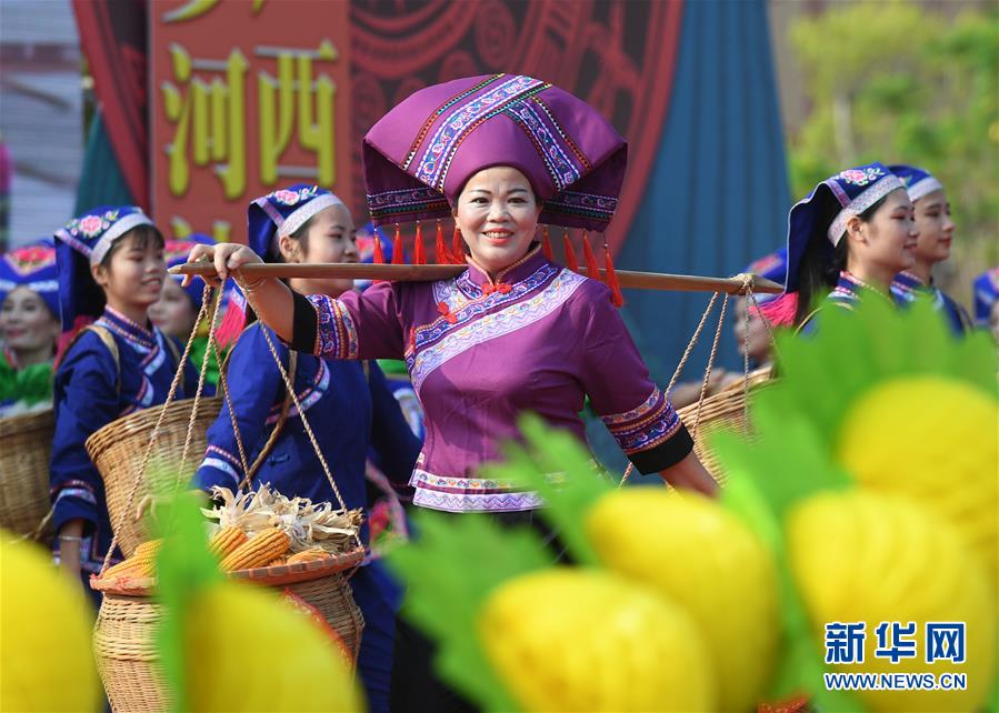 9月17日,廣西都安瑤族自治縣密洛陀文化公園廣場(chǎng),演員在啟動(dòng)儀式上表演節(jié)目《在希望的田野上》。 當(dāng)日,2019年廣西慶祝“中國(guó)農(nóng)民豐收節(jié)”啟動(dòng)儀式暨河池市“慶豐收·促脫貧”系列活動(dòng)在都安瑤族自治縣舉行,各族群眾和來(lái)賓一起載歌載舞歡慶豐收節(jié)。 新華社記者 陸波岸 攝