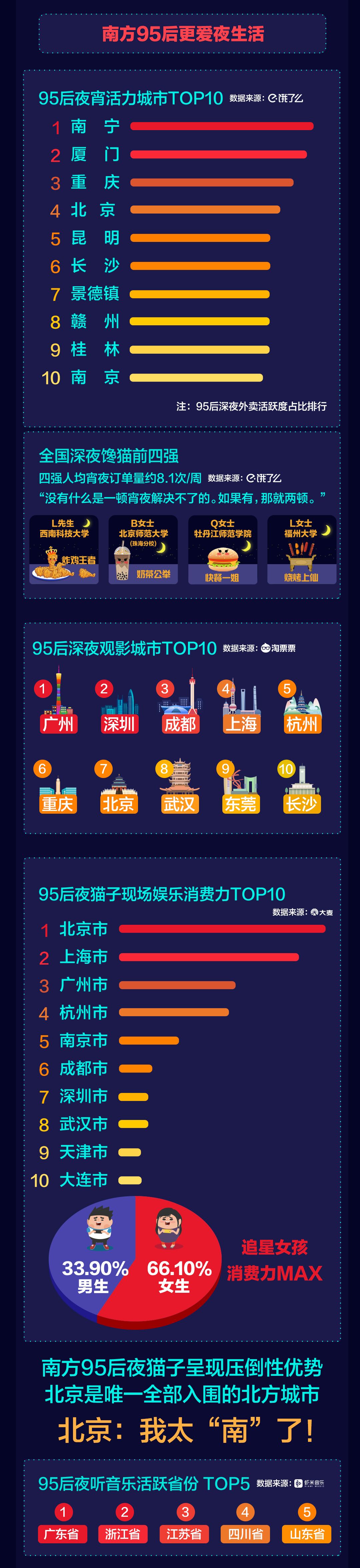 《95后夜貓子報告》綜合數(shù)據(jù)顯示,無論是觀影、追星、聽音樂,還是吃宵夜,南方95后夜貓子的活躍度都呈現(xiàn)壓倒性優(yōu)勢。95后宵夜活力城市TOP10、95后深夜觀影城市TOP10、95后夜貓子現(xiàn)場娛樂消費力TOP10榜單里,入圍城市均以南方城市為主。