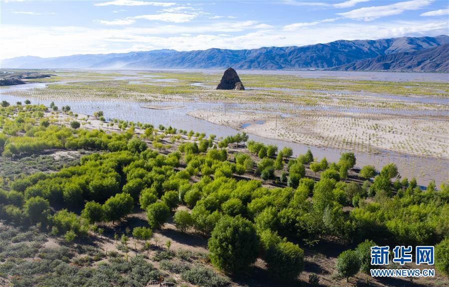 西藏雅魯藏布江兩岸栽植的樹木(7月16日無人機拍攝)。新華社記者普布扎西攝