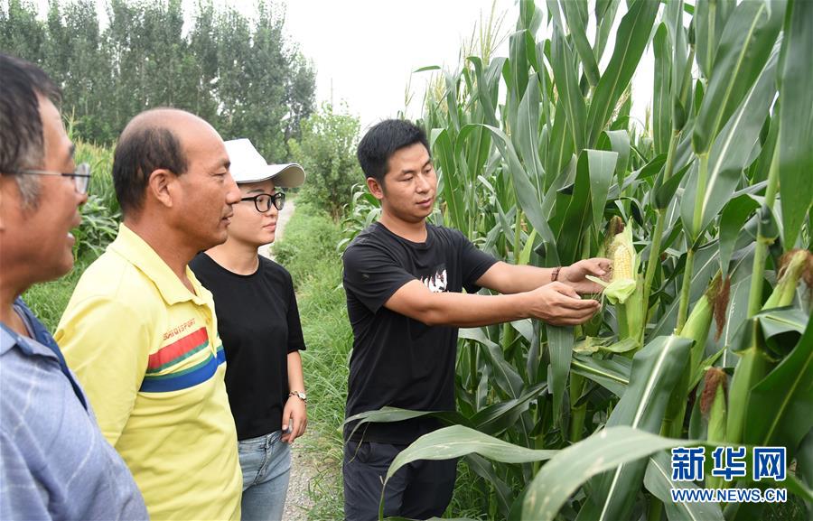 在山東省德州市平原縣的農(nóng)場玉米地里,楊春雷(右一)、卜璐璐(右二)指導(dǎo)當(dāng)?shù)剞r(nóng)戶學(xué)習(xí)有關(guān)科學(xué)種植的知識(8月22日攝)。 新華社記者 王凱 攝