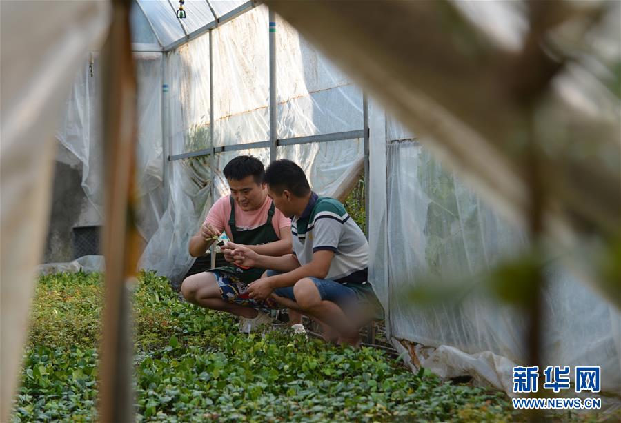 在沭陽(yáng)縣新河鎮(zhèn)新槐村,張炎(左)在育苗棚內(nèi)和哥哥一起查看月季花幼苗長(zhǎng)勢(shì)(8月24日攝)。 新華社記者 任鵬飛 攝