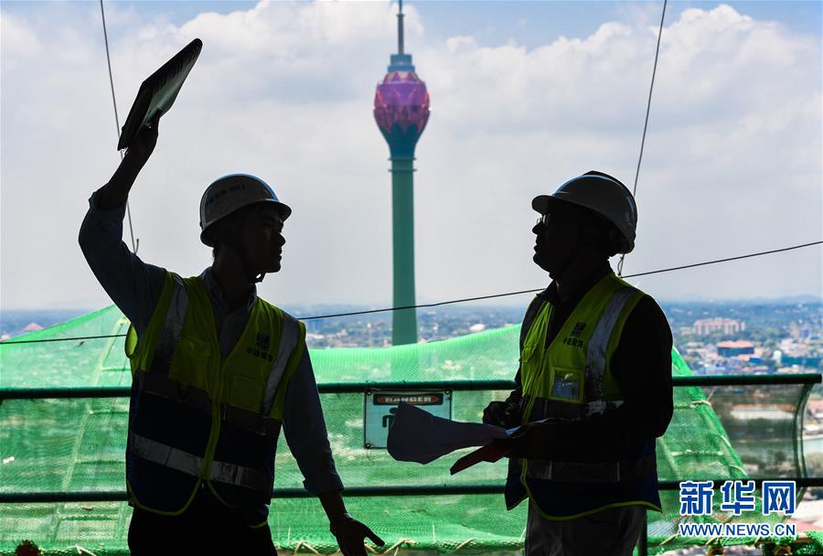 2019年4月9日,在斯里蘭卡科倫坡,中方項(xiàng)目經(jīng)理?xiàng)钭咏ㄗ螅┡c項(xiàng)目副經(jīng)理Thuwan在工地討論工作進(jìn)度,他們背后是科倫坡地標(biāo)建筑蓮花塔。Thuwan是中國(guó)中建裝飾集團(tuán)深圳裝飾公司斯里蘭卡濱江度假村項(xiàng)目的副經(jīng)理。在中方管理人員手把手的指導(dǎo)下,Thuwan從最初的一名普通商務(wù)員變成了一位優(yōu)秀的屬地化管理人員,成為了中斯雙方人員溝通的橋梁。新華社記者劉大偉攝