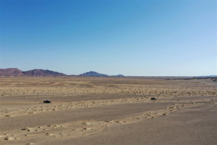 9月25日,內(nèi)蒙古自治區(qū)額濟(jì)納旗算井子邊境派出所的民警開車對轄區(qū)進(jìn)行巡護(hù)(無人機(jī)拍攝)。新華社記者劉磊攝