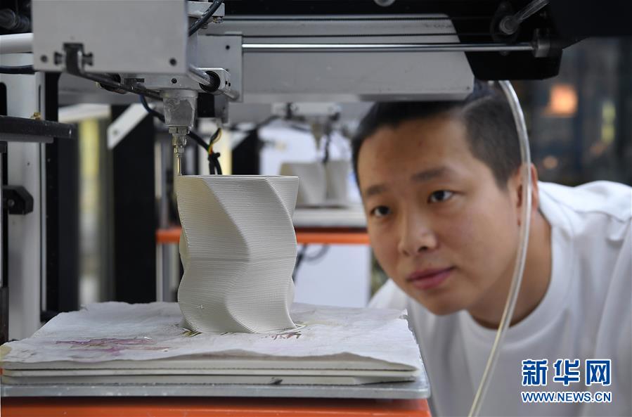 在江西景德鎮(zhèn)陶溪川文創(chuàng)街區(qū)的陶瓷3D打印體驗(yàn)中心,一位工作人員在用3D打印技術(shù)制作陶瓷花瓶(7月26日攝)。新華社記者 萬象 攝