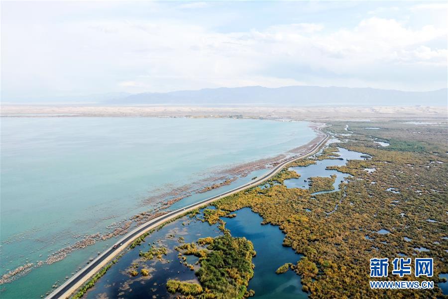 這是新疆博斯騰湖美景(10月12日無人機(jī)拍攝)。入秋以來,新疆博斯騰湖碧波蕩漾,美景如畫,吸引各地游客前來游玩。新華社記者丁磊攝