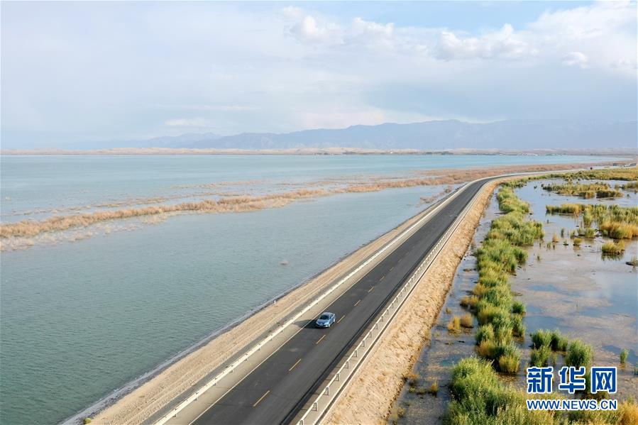 這是新疆博斯騰湖河堤公路(10月12日無人機拍攝)。入秋以來,新疆博斯騰湖碧波蕩漾,美景如畫,吸引各地游客前來游玩。新華社記者丁磊 攝