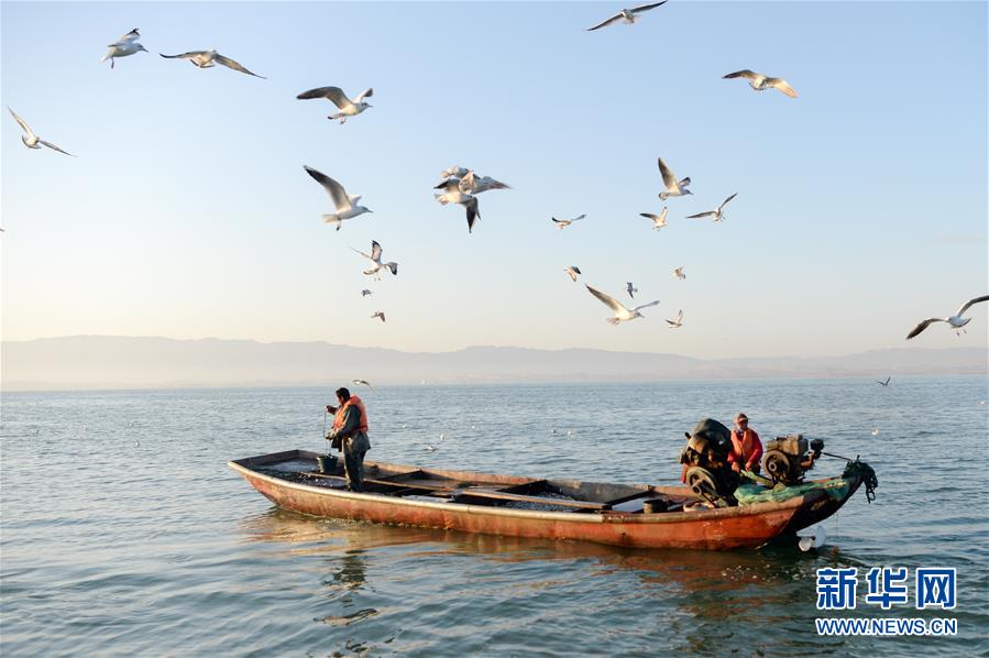 新疆博湖縣的漁民在博斯騰湖捕魚(10月12日攝)。入秋以來,新疆博斯騰湖碧波蕩漾,美景如畫,吸引各地游客前來游玩。新華社記者丁磊 攝