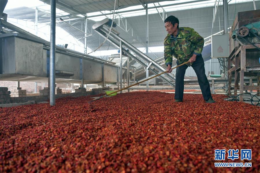 在奪火鄉(xiāng)高谷堆村,村民在晾曬山楂片(10月14日攝)。 新華社記者 曹陽 攝