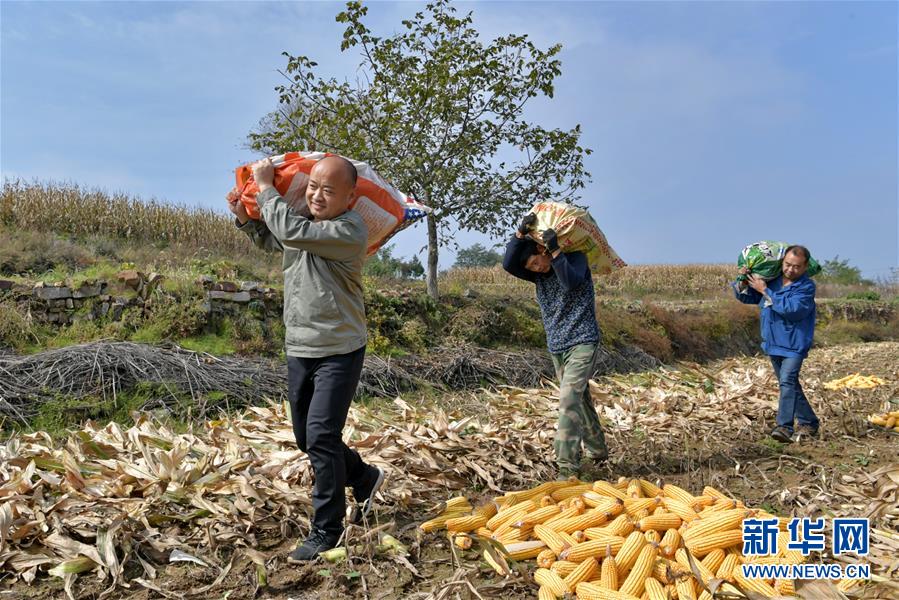 在奪火鄉(xiāng)高谷堆村,第一書記侯俊國(左)在幫助村民收玉米(10月13日攝)。 新華社記者 曹陽 攝