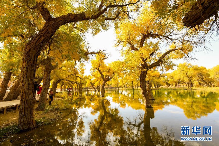 10月16日,這是內蒙古阿拉善盟額濟納旗境內的胡楊林。金秋時節(jié),位于內蒙古阿拉善盟額濟納旗境內的胡楊林披上了金黃色的外衣,在陽光的照射下呈現(xiàn)絢麗奪目的色彩,成為沙漠深處的一抹亮色。新華社記者彭源攝