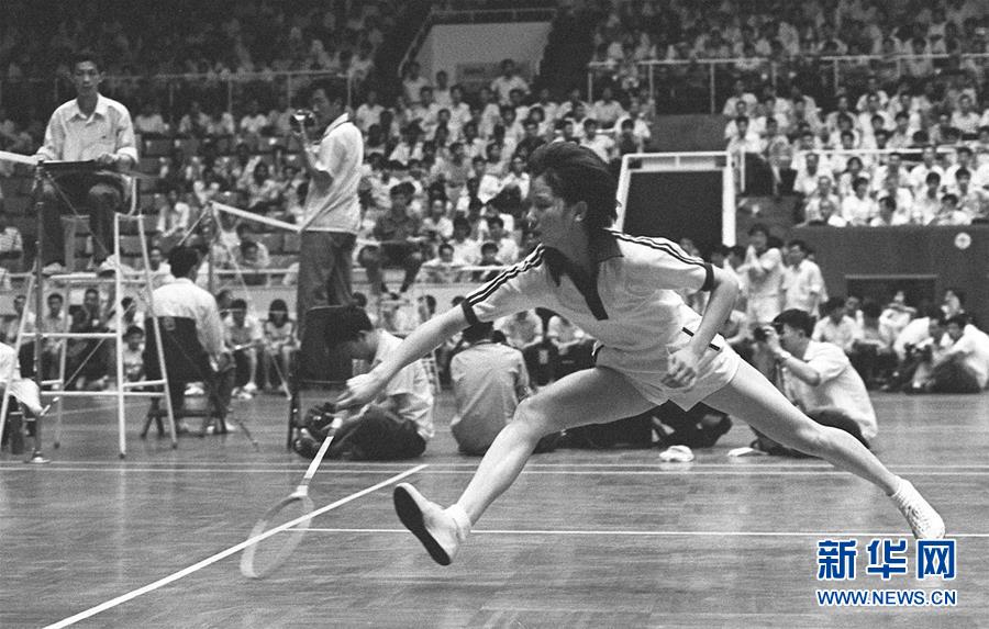 圖為韓愛萍在杭州舉行的第二屆世界羽毛球錦標賽女子單打比賽中跨步救球(資料照片),她最終奪得女單冠軍。新華社記者胡越攝