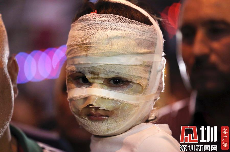 當(dāng)?shù)貢r間2016年7月9日,伊拉克卡拉達,4歲的Asal Ahmed在爆炸現(xiàn)場被爸爸抱著。開齋節(jié)期間,Asal和媽媽一起逛街,結(jié)果碰上一起自殺性炸彈襲擊,兩人都嚴(yán)重?zé)齻?/p>