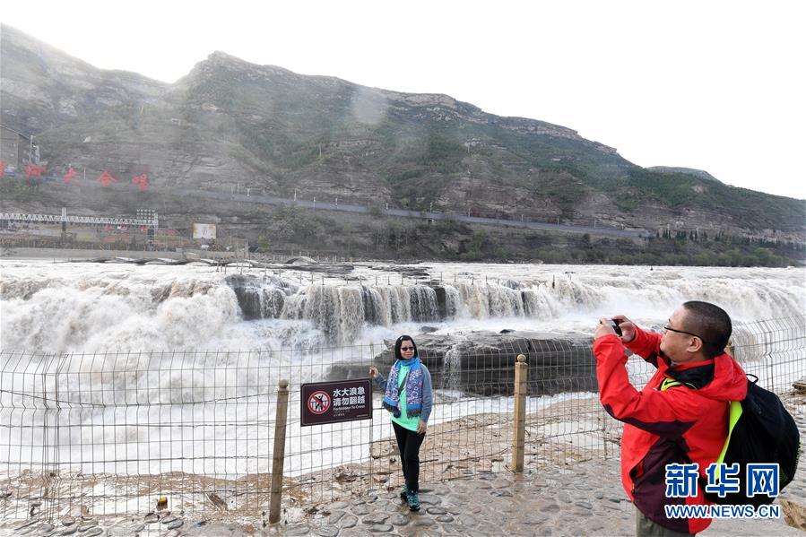 受近日降雨影響,位于山西吉縣的壺口瀑布水量增大,壯美的瀑布群景觀吸引眾多游客前來觀賞。新華社記者楊晨光攝