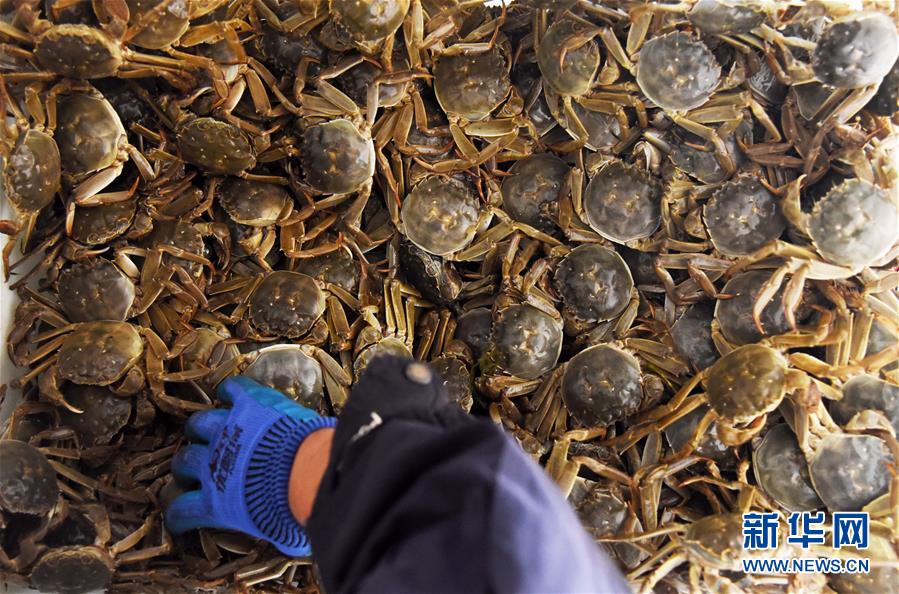 10月17日,東營市惠澤農(nóng)業(yè)科技有限公司黃河口大閘蟹養(yǎng)殖區(qū)的工人在撿拾大閘蟹進行稱重。新華社記者 王凱 攝