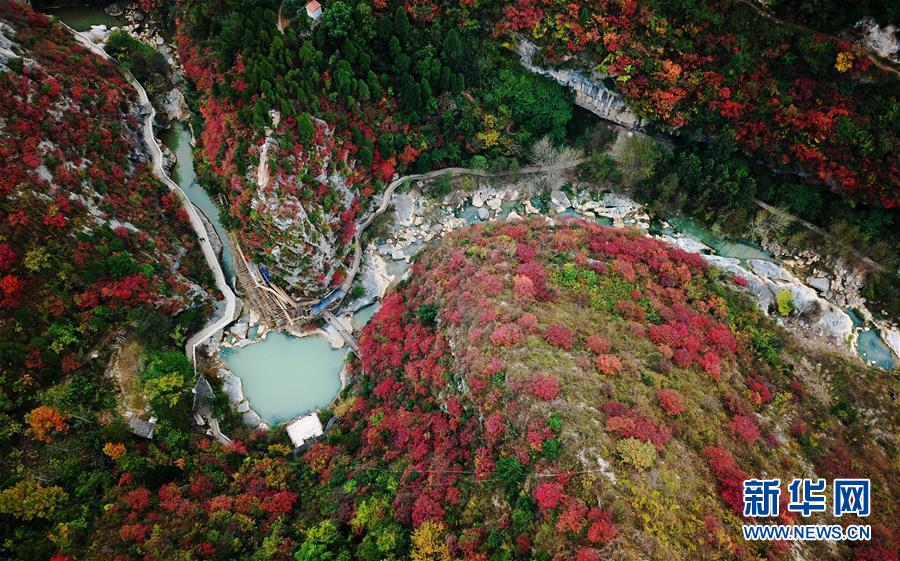 這是10月19日無(wú)人機(jī)拍攝的河北省涉縣太行紅葉大峽谷景色。金秋十月,河北省涉縣偏城鎮(zhèn)太行紅葉大峽谷的紅葉進(jìn)入觀賞佳期,吸引眾多游客前來(lái)登山賞景。新華社記者王曉攝