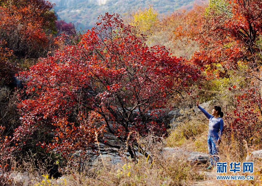 10月24日,游客在河北省武安市賀進(jìn)鎮(zhèn)后臨河村觀賞紅葉。新華社記者王曉攝