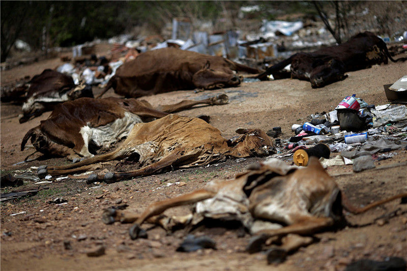 當(dāng)?shù)貢r間2017年2月12日,巴西帕拉伊巴,路上躺著牛的尸體。