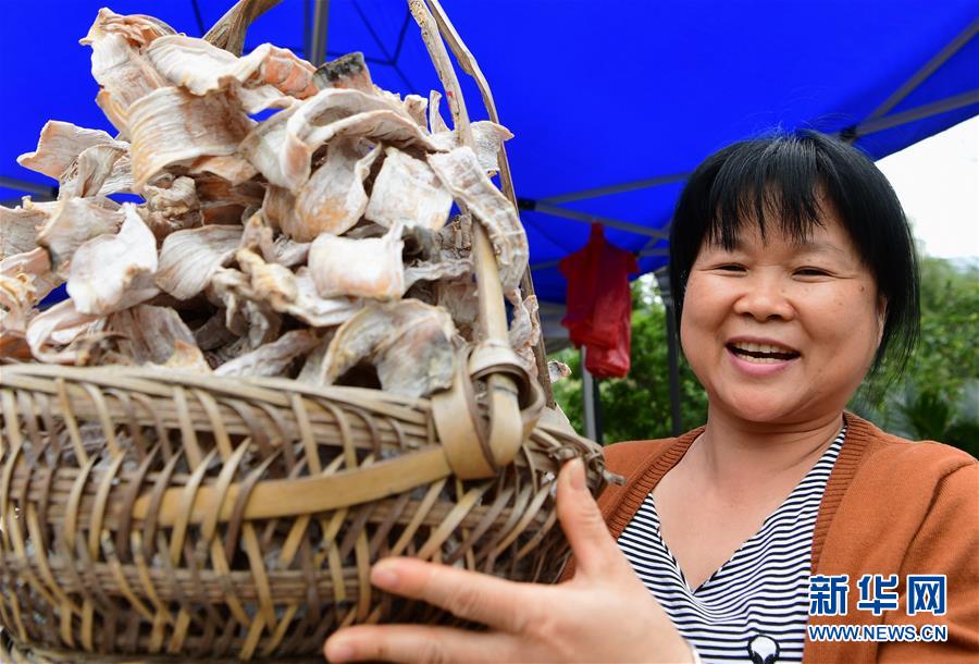 在龍巖市永定區(qū)湖坑鎮(zhèn)南江村停車場,村民王贈娘展示自己生產(chǎn)的筍干。從事涉旅行業(yè)后,她的年收入從原來的七八萬元增加到20多萬元(5月4日攝)。新華社記者魏培全攝