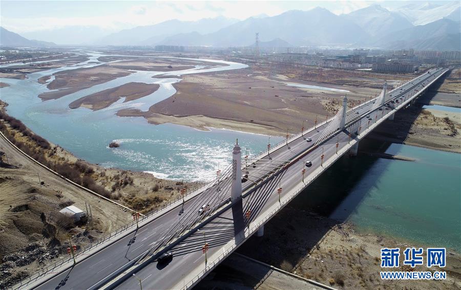 這是橫跨在拉薩河上的拉薩市區(qū)公路(4月3日無人機拍攝)。 新華社記者 晉美多吉 攝