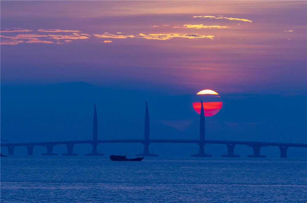 2018年10月22日早晨,從廣東珠海市的情侶路向東眺望,一輪紅日從東方冉冉升起,將港珠澳大橋映射得格外迷人?!俺壒こ獭备壑榘拇髽?qū)⒂?4日上午9時正式通車。張煒(香港分社)/中新社/視覺中國