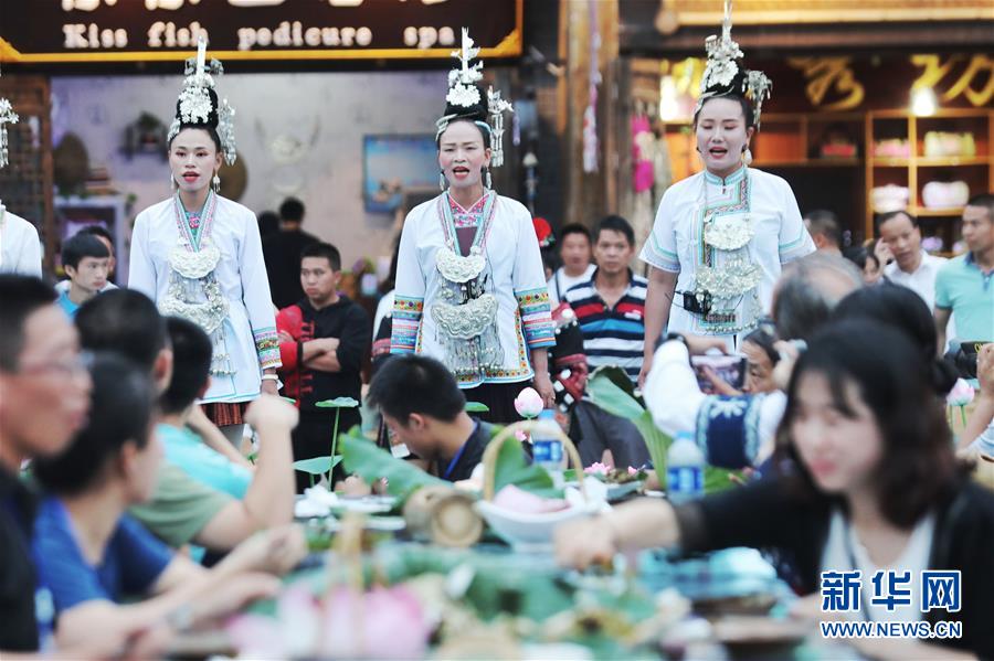 7月2日,侗族同胞在丹寨萬達(dá)小鎮(zhèn)內(nèi)為游客演唱侗族大歌。新華社記者歐東衢攝