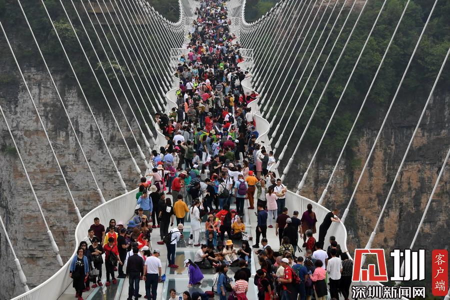 2019年4月24日,湖南張家界大峽谷玻璃橋上,游客們擺出各種姿勢(shì)拍照。剛開始,游客們?cè)诙虝旱目謶种?,隨之而來的是滿滿的興奮,男女老少紛紛在這座懸在300多米高空中的全透明玻璃橋上不停拍照,從一開始走上橋緊張的不敢踩在玻璃上,到最后在玻璃橋上的各種躺和趴,各種姿勢(shì)各種創(chuàng)意各種拍攝,游客們完全忘我地開心游玩。張家界大峽谷玻璃橋,是世界首座斜拉式高山峽谷玻璃橋,玻璃橋全長(zhǎng)430米,寬6米,橋身距離谷底垂直落差300米,大橋表面由99塊透明玻璃鋪設(shè)而成,整個(gè)工程無鋼筋混凝土橋墩。