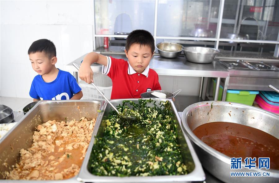 9月3日,金寨縣希望小學(xué)學(xué)生在盛午飯。新華社記者張端攝