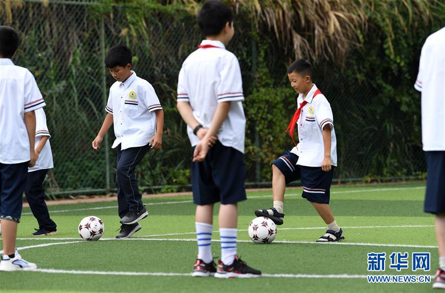 9月3日,金寨縣希望小學(xué)學(xué)生在足球課上訓(xùn)練。新華社記者張端攝