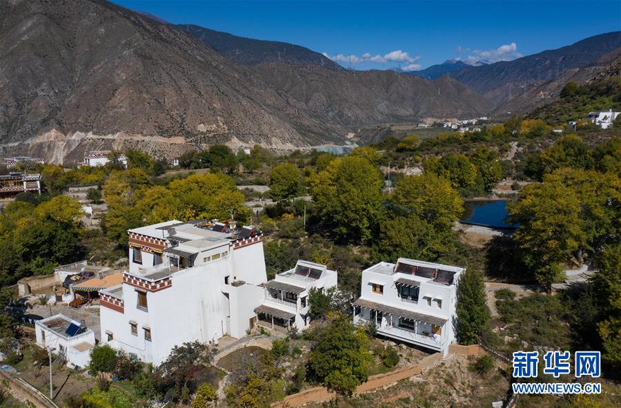 10月29日,四川省鄉(xiāng)城縣的定曲河峽谷的青德鄉(xiāng),民宿“皈院”錯(cuò)落有致,保留白藏房傳統(tǒng)民居特色(無(wú)人機(jī)拍攝)。新華社記者江宏景攝