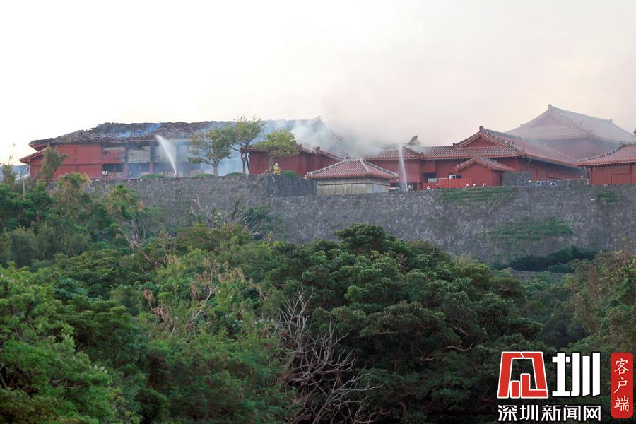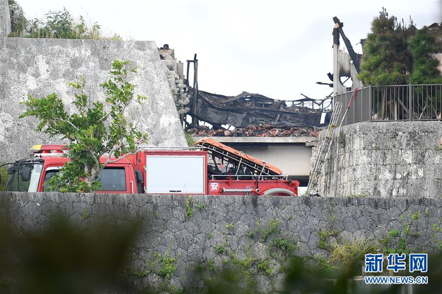 10月31日,在日本沖繩縣那霸市,消防人員站在琉球王國(guó)都城遺址首里城外。新華社記者華義攝